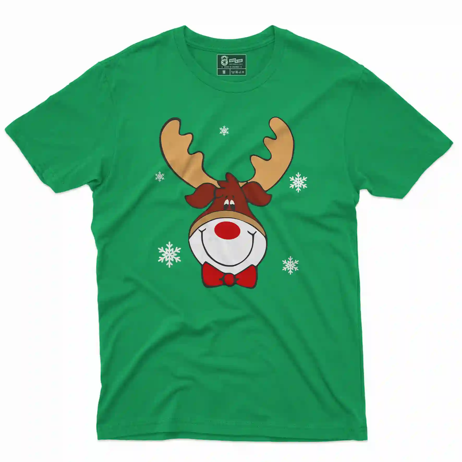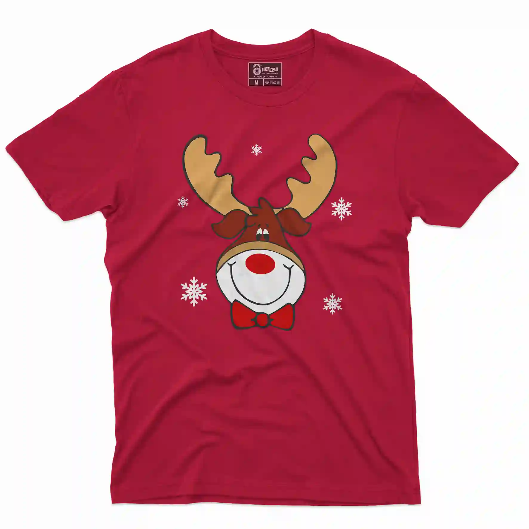 Camiseta de Navidad con Un Lindo estampado de un  Reno Navideño que esta propiamente decorado con el espiritu de la navidad.
